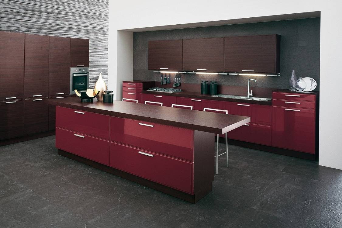 Кухни бордового цвета помогут сделать лаконичный интерьер более живым. Минимальное количество декора компенсируется благодаря насыщенной палитре. В просторном помещении лучше брать за основу серую палитру. Создать роскошную обстановку позволят фасады гранатового цвета.