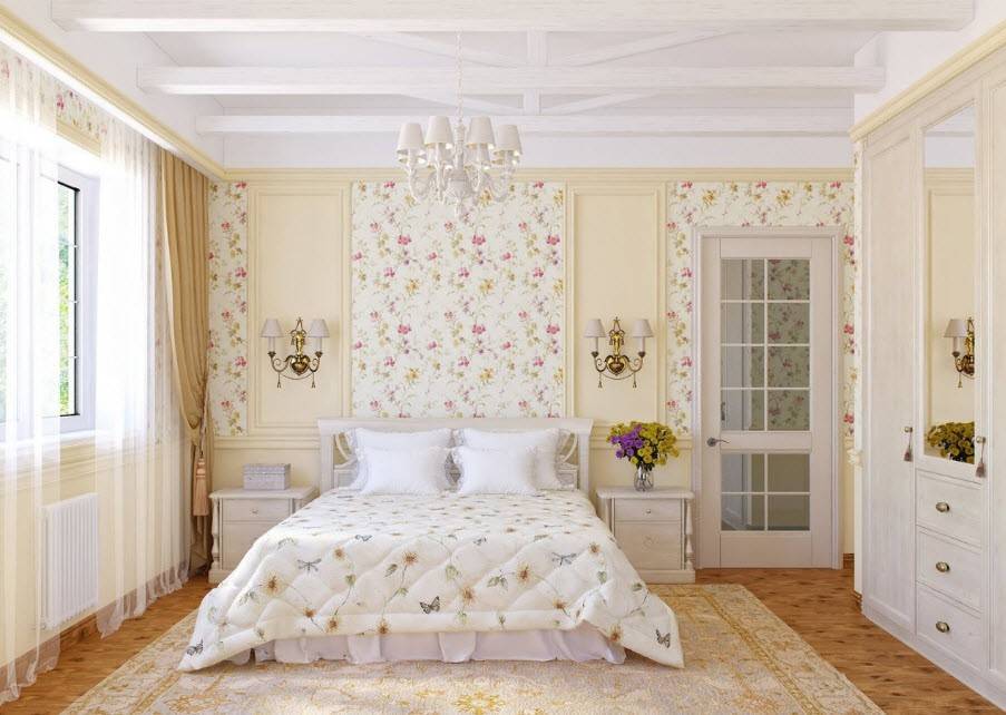 Романтический прованс, пришедший к нам с южных берегов Франции предполагает обои пастельных тонов. А также для оформления интерьера спальни можно использовать обои с цветочным принтом.