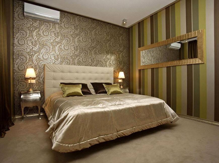 - Когда на разных видах обоев есть принты, то они должны быть одинакового цвета и насыщенности, чтобы подходить друг к другу. Такое решение поможет избежать перегруженности интерьера спальной комнаты.