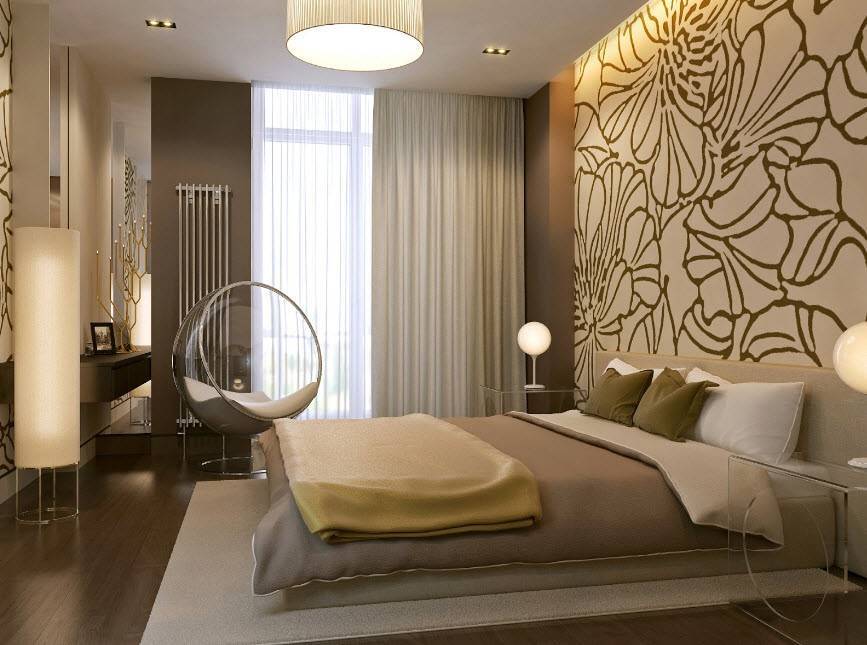 Современный стиль. Для оформления спальни используются гладкие однотонные обои. Матовая поверхность сделает помещение более уютным, а глянцевая отделка наполнит внутреннее пространство светом. А также можно использовать обои с графическим рисунком или абстракцией, также допускаются монохромные узоры на одной из стен спальни.