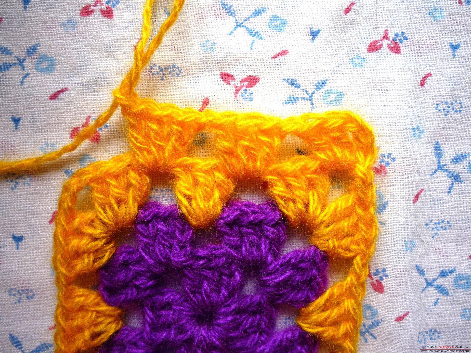Первые 2 ряда в нём вяжутся аналогично обычному квадрату (фиолетовая пряжа). У меня так связаны 3 ряда (и 1 жёлтый ряд). Затем будем вязать только по двум сторонам. В углу делаем 3 вп, 2 сн и вяжем одну сторону.