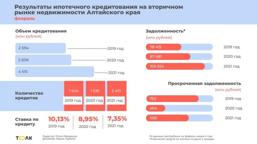 Между тем ипотечный портфель нашего региона буквально “распух”, удвоившись в феврале 2021-го к результатам февраля 2020 (см. инфографику). Не исключено, что тон задали инвесторы и политика мэрии краевой столицы, которая “буксует” с выделением земли под жилье и провоцирует его дефицит.