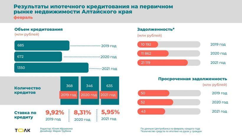 Пока же ситуация стабильная. В отчете по состоянию рынка ипотеки Центробанк отмечает, что в декабре 2020 года на первичном рынке в крае оформили 835 кредитов. На фоне такой высокой базы январь 2021-го оказался провальным – всего 371 сделка, но уже по итогам февраля – 635 сделок.