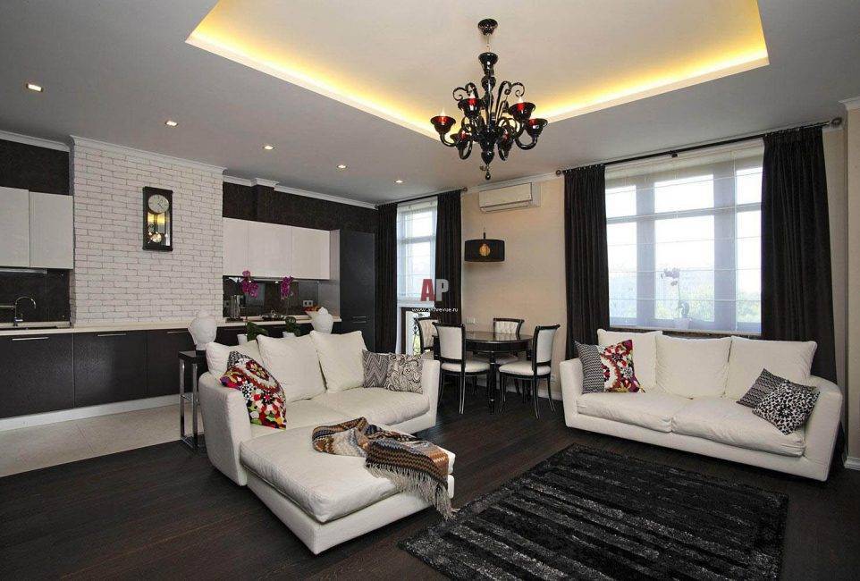 Мечтаете о яркой гостиной, но боитесь переборщить с любимыми оттенками? Темный верх комнаты приглушит любое буйство красок, а также добавит площади элегантности. Черно-белая тональность помещения всегда выглядит серьезно, роскошно и претенциозно. Поэтому идеально подходит для гостиных, холлов и больших залов в глянцевом исполнении.