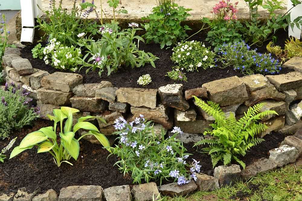 Приподнятость цветника достигается за счет парапета, выложенного из кирпичей, дикого камня или бетонных блоков. Внутреннее пространство заполняется почвой с таким расчетом, чтобы она не пересыпалась через край. Растения высаживаются по тем же принципам, что и на обычной нерегулярной клумбе.