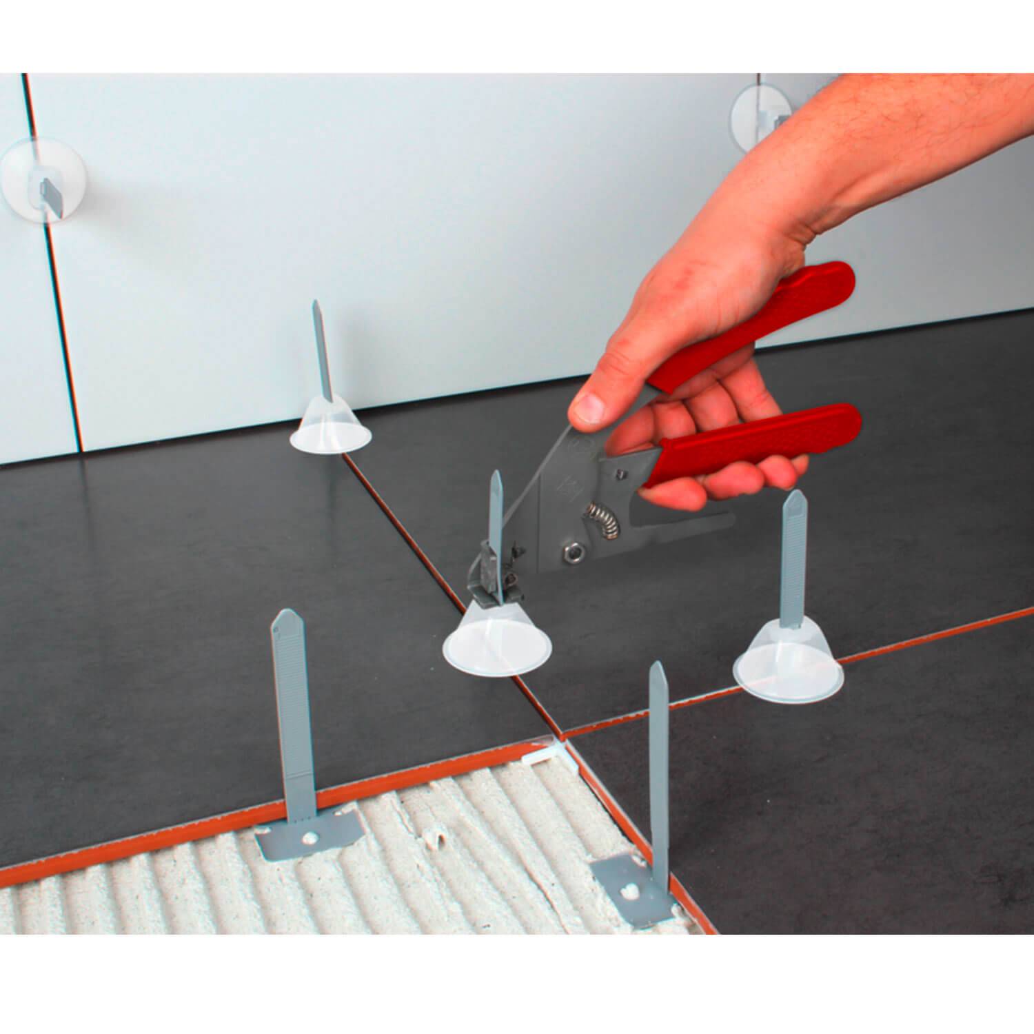 Колпачковая – в ней клинья из пластика оснащены фиксирующим замком внутри. Их используют для плит с толщиной 0.5-2.5 см. Они представляют собой рифленый одноразовый стержень и прижимной колпачок с зажимом. Для стяжки плитки такой системой требуется дополнительное устройство, которое идет в комплекте или его можно купить отдельно