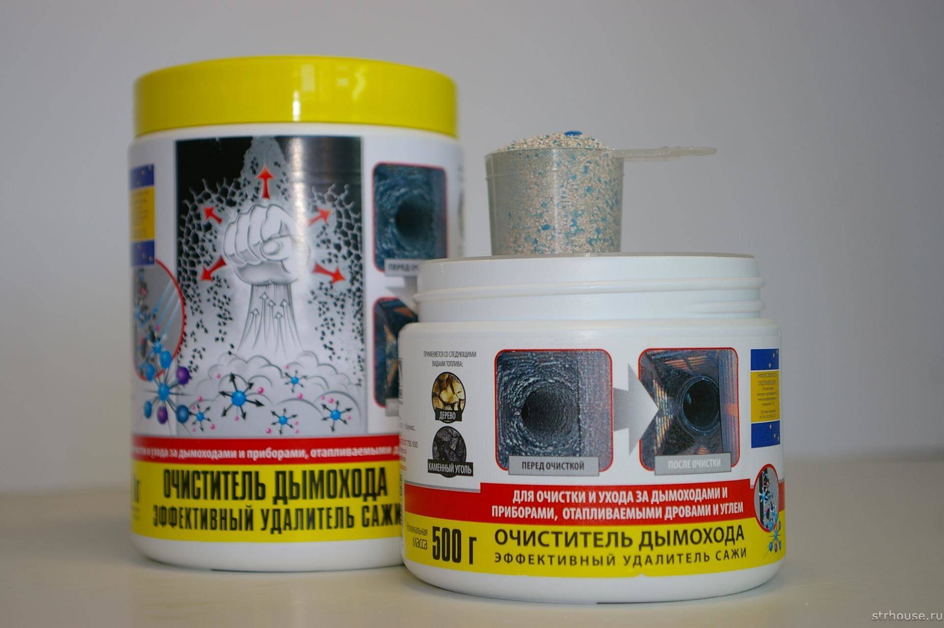 Почистить дымоход от сажи, можно применив специальные покупные препараты, купить которые можно в любом профильном магазине