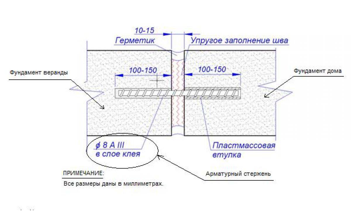 По своей сути любой деформационный шов, посредством которого производится соединение к дому фундамента для другого строения, представляет собой утеплитель в зазоре между цокольными перекрытиями и стенами. Нередко в качестве данного утеплителя используется обыкновенная пакля. Место, в котором производится соединение с домом, огораживается специальной декоративной накладкой, которая крепится к домовой стене.