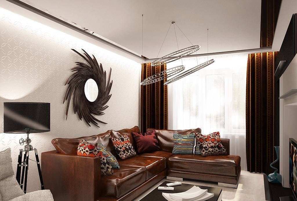 Жители крупных городов будут чувствовать себя в коричневой гостиной особенно комфортно. Она словно создаст непроницаемый кокон, который укроет от обилия шумовых и цветовых эффектов мегаполиса.