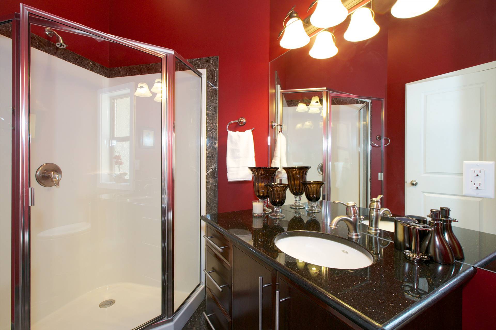 Если ваша спальня оформлена в красно-белых тонах, имеет смысл придерживаться такой же цветовой гаммы и в соседней ванной комнате. Пурпурный – доминирующий оттенок в этом пространстве. Можно смягчить его воздействие с помощью правильно подобранного освещения. Это особенно актуально для интерьеров маленьких ванных комнат. Умное сочетание ярких акцентов и светильников является ключом к оригинальному дизайну.