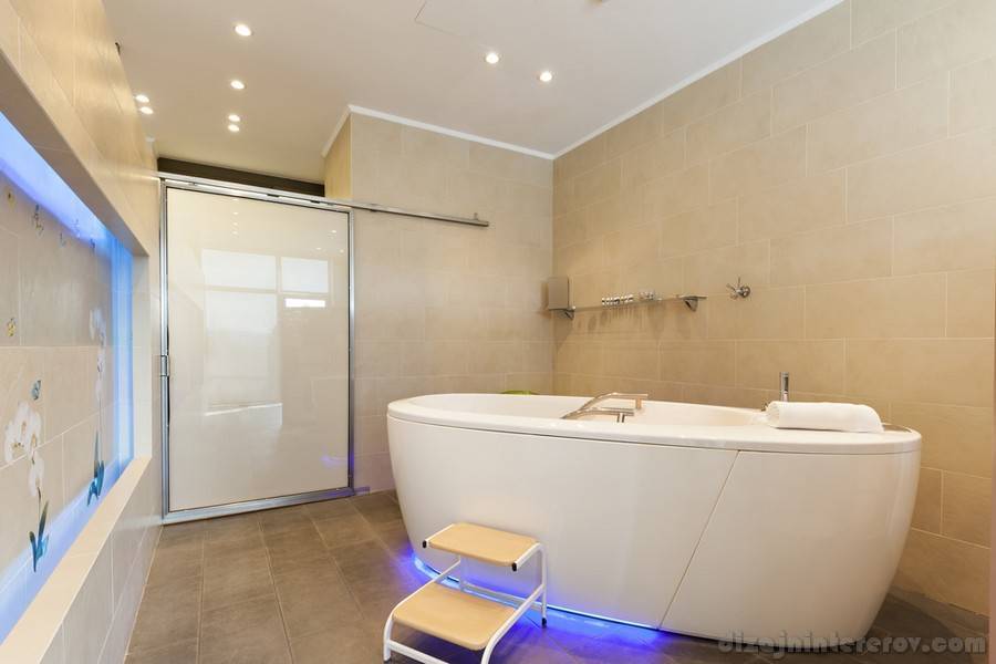Светильники, монтируемые в ванной, используются не только на потолке и стенах. Модным, например, считается размещение светильников в купелях и джакузи из прочного стекла и акрилово-стеклянных материалов. Это еще больше украшает интерьер