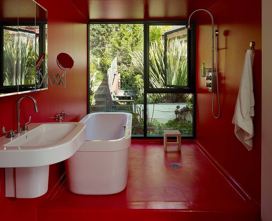 Блестящая смесь серебристого и красного в современной ванной комнате (дизайн Venture Architecture)
