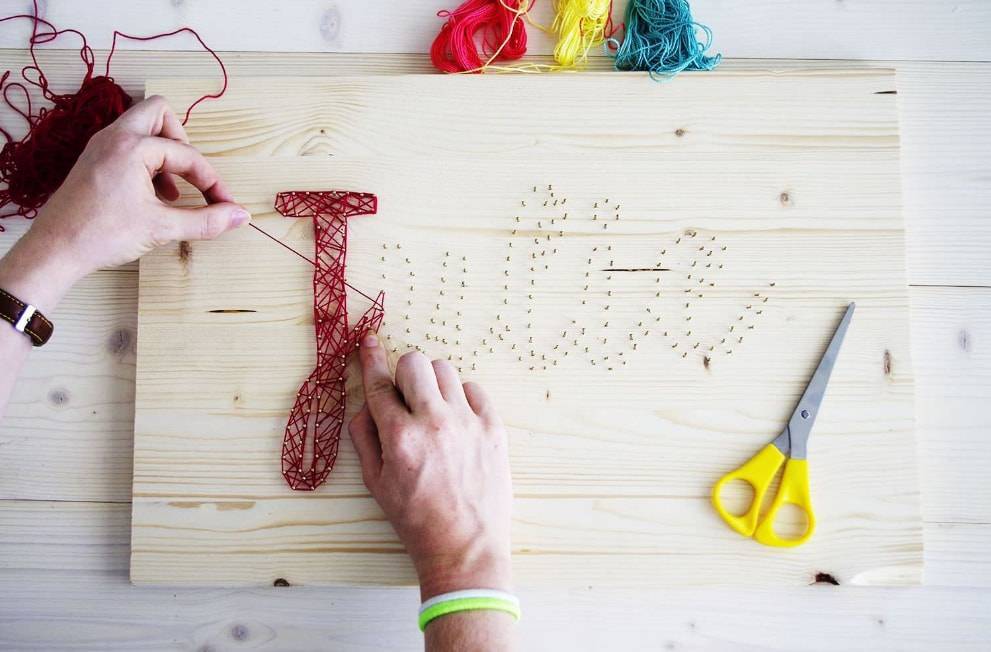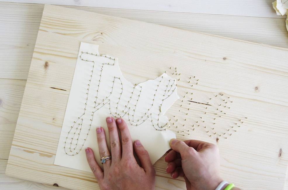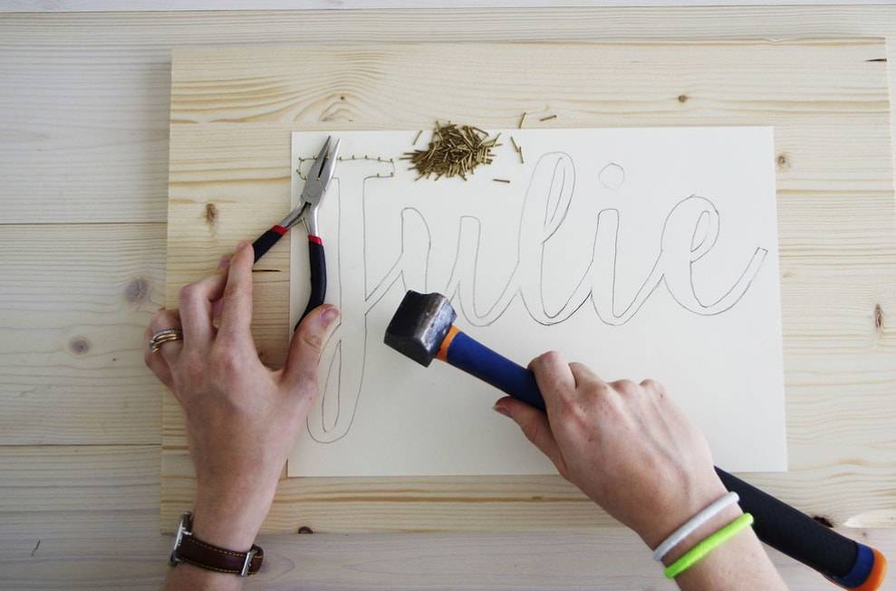 Кладем листок с именем на деревянную доску. Фиксируем гвоздь на крае буквы и забиваем его молотком. Поочередно вбиваем остальные гвозди на равном расстоянии.