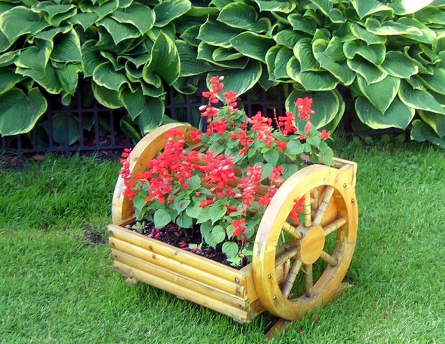 Телега из дерева станет очень аутентичным украшением в сельской местности, если вы оформили свой участок, скажем, в кантри стиле. Кроме того, отличной идеей станет вазон для цветов, вы сможете выращивать растения прямо внутри этого элемента садового декора.