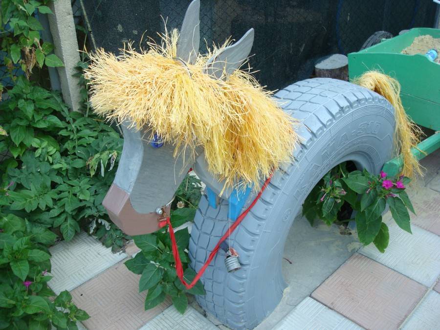 Хорошей идеей оформления сада станет использование автомобильных шин, тем более, что их можно разрисовать всеми цветами радуги, уложить в несколько слоев, создав миниатюрное подобие природной террасы. Отлично и пока не совсем обычно смотрятся горизонтальные и вертикальные подвесные клумбочки из этого ненужного материала.