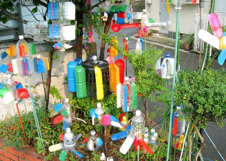 Детали декора – приукрасить участок с заборами и стенами красивыми самоделками из пластиковых разноразмерных бутылок, цветных крышек, обычных панелей и черных покрышек.
