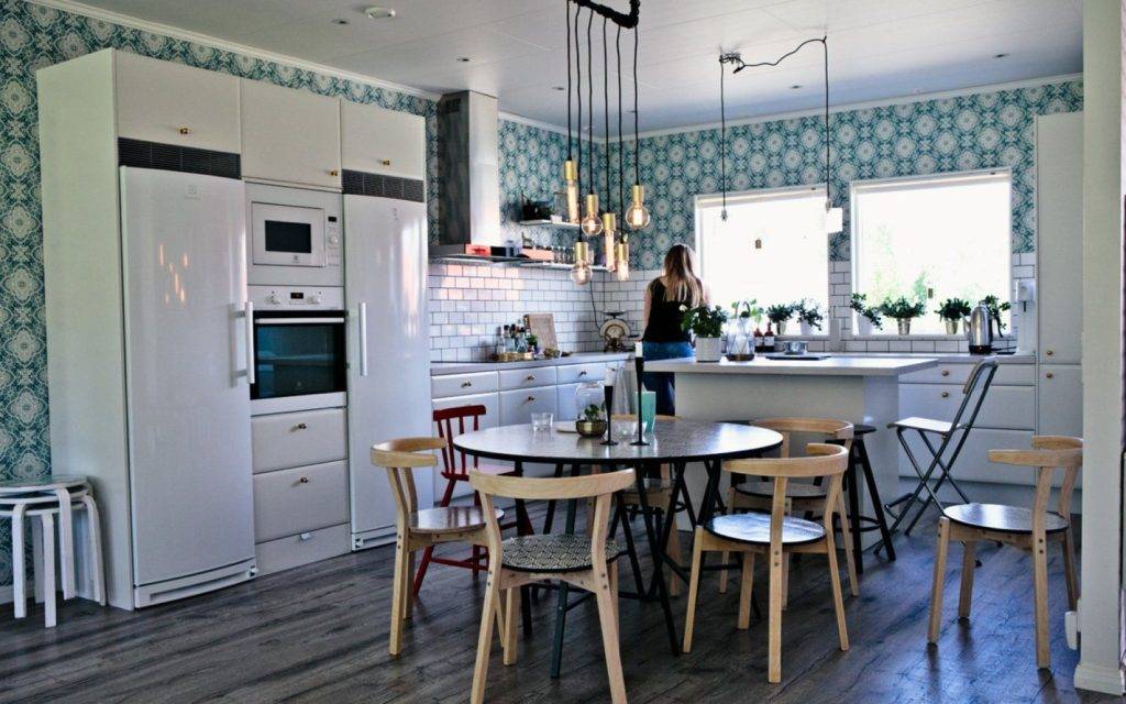 В любом случае – лампы, висящие над рабочей поверхностью, островом или большим столом, также являются сильным акцентом. Это украшение, которое в сочетании с отсутствием верхних шкафов означает, что сначала этот интерьер не воспринимается как кухня.