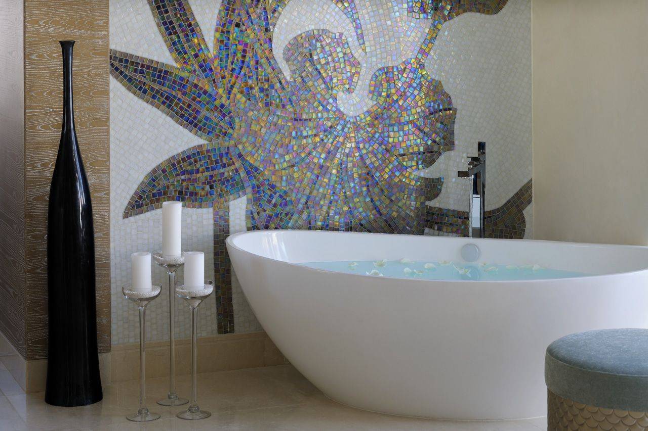 Привлекательностью отличается и композиция маленьких размеров, но площадь ее для достижения должного эстетического эффекта должна составлять не более половины всей области стены. Панно, обладающее горизонтальной стороной, большой по длине, способствует расширению помещения, а конструкция, которая протянута по вертикали, зрительно увеличивает его высоту. Иногда плитка панно для ванной комнаты может занимать всю стену, в частности, если применяется фотопанно или специальная мозаика. Дело в том, что многие владельцы домов и квартир желают покрыть таким рисунком всю стену, чтобы композиция выглядела целостно и естественно. Такое панно делается по индивидуальному заказу. При необходимости расположения панно в нише, размеры конструкции должны обеспечивать ее полноценное размещение и остаток свободного места для рамки