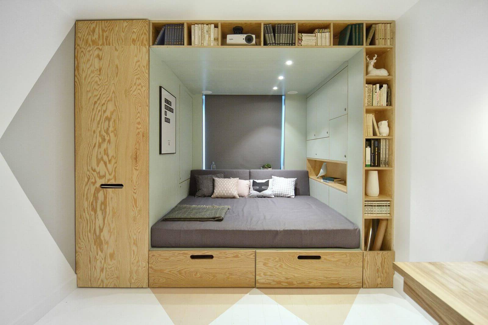 На фото спальня и ниша с кроватью на подиуме, оборудованном выдвижными ящиками.