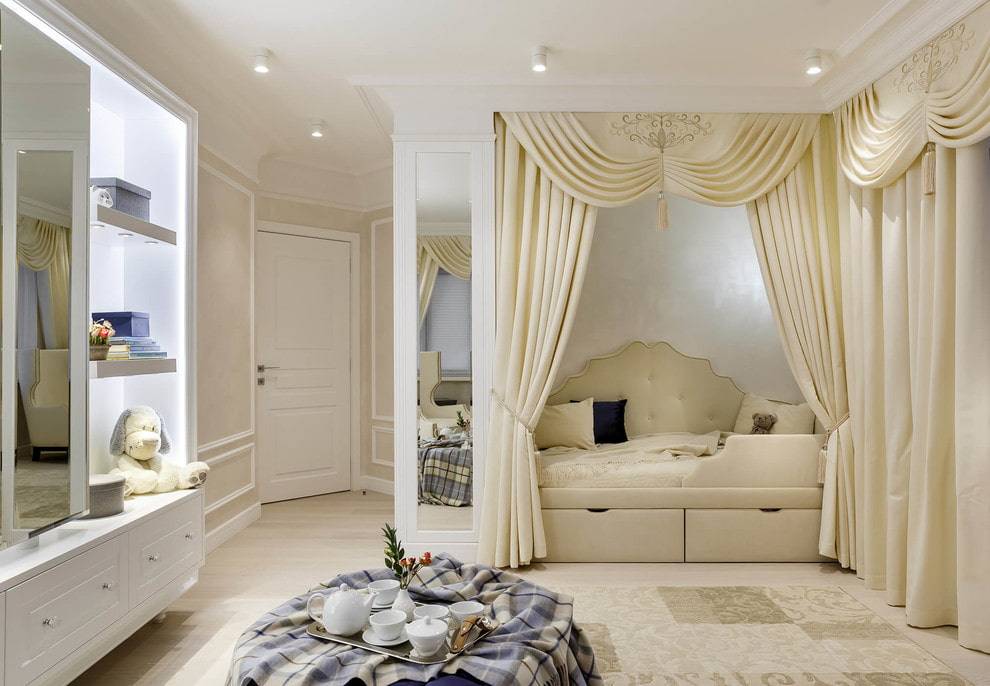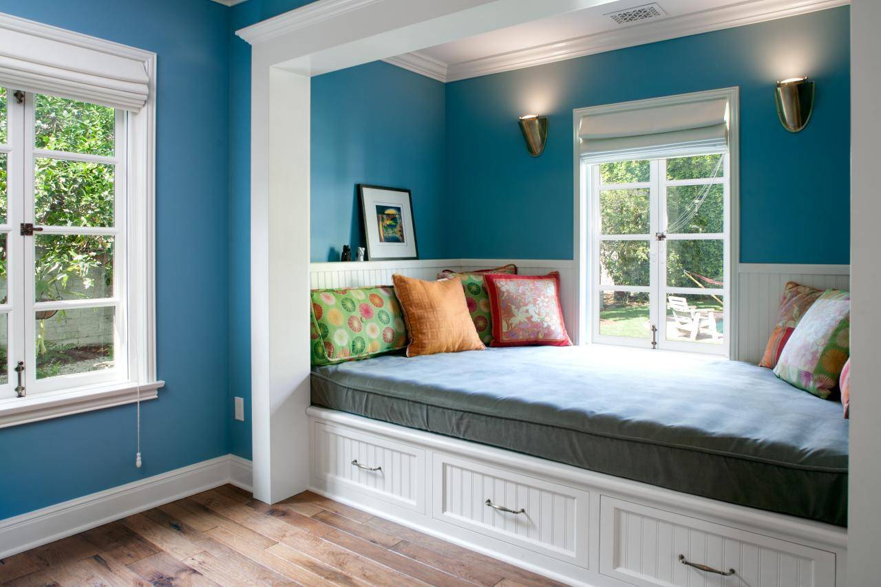 Такая ниша будет выглядеть как небольшая пещерка в стене. К тому же, в ней можно вырезать полочки по бокам. В своей спальне вы можете класть в них самое необходимое, то, что обычно кладете на прикроватную тумбочку. А в детской эти полки могут служить домиком для мягких игрушек или книжным шкафчиком. Кстати, в нижней части ниши можно оборудовать ящики для постельного белья. Также, глубокие ниши можно закрывать шторками или створками. Это позволит спрятать спальное место, если вы вынуждены совмещать спальню и гостиную.