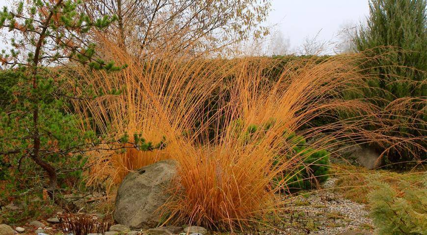 К примеру, в ландшафтном дизайне сада вы можете задействовать повислую осоку: она способна вырасти до 1,2 метров. В сезон цветения на растениях появляются «серьги». Этому сорту нужна вода, поэтому предпочтительно сажать его рядом с водоемами, комбинируя с баданами и хостами.