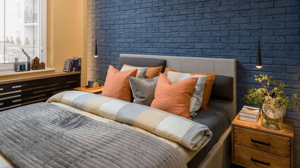 Серая кирпичная стена – лучшее решение для изысканной спальни.