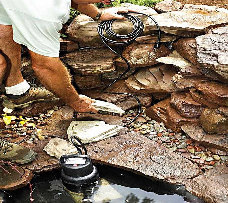 В подобных водоемах используются погружные насосы. Их ставят на дно, установив в корзину с камнями, или просто придавив корпус нескольким валунами. Он забирает воду из емкости, подавая ее в шланг, который крепится к выходному патрубку. Этот шланг и прокладываете к тому месту, откуда будет бежать вода.
