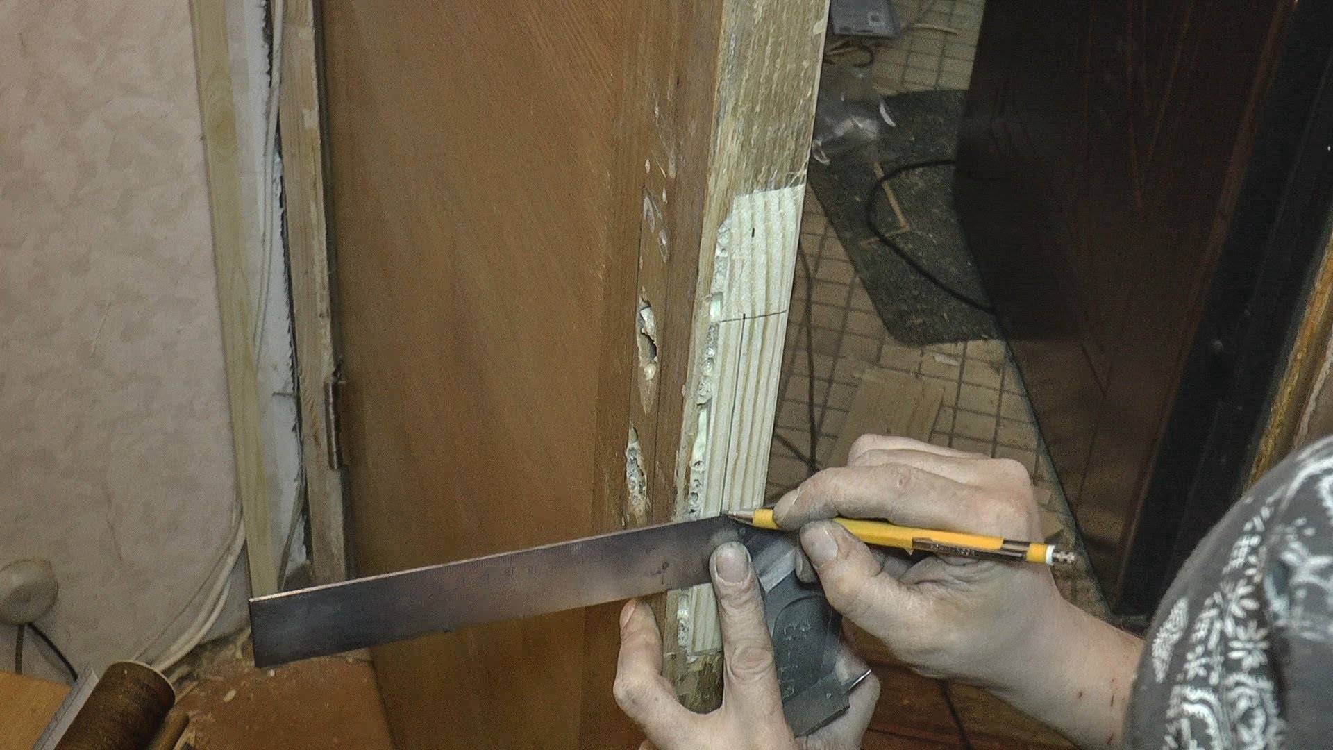 - Сделайте разметку для установки колец. Их примерное расположение – на расстоянии 20 см от торца деревянной двери.