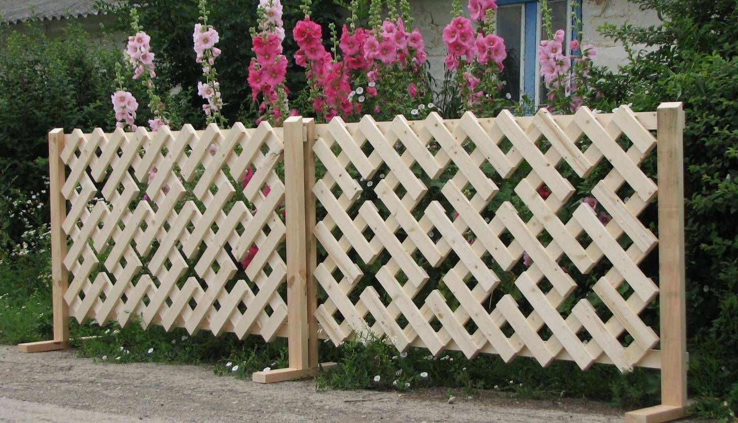 Эта разновидность обычно используется в качестве декоративной — прочность у нее небольшая, зато выглядит красиво. Ажурные решетчатые заборы устанавливают для зонирования или украшения приусадебного участка. Строят такие ограждения из узких ровных досок, которые скрещивают под прямо или по диагонали.