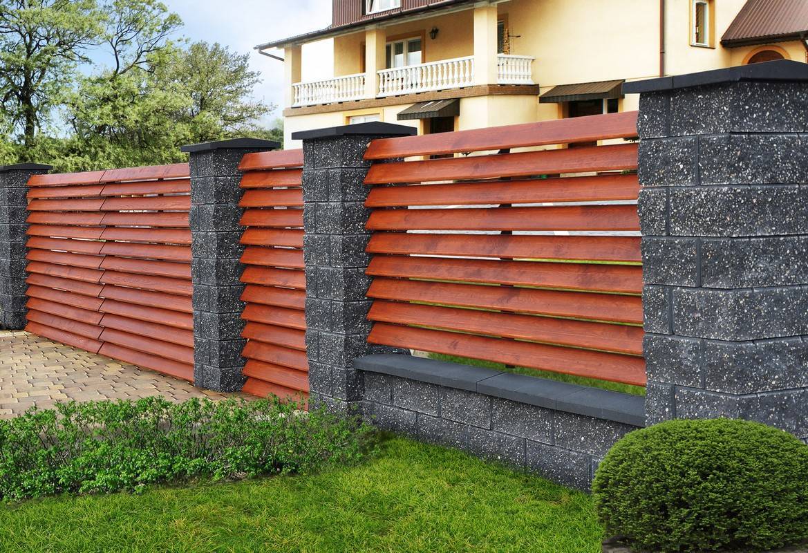 Опоры также необязательно делать из дерева. Хороший и недорогой вариант – металлические трубы, установленные в бетонное основание или вкопанные в землю. Но особенно эффектно смотрятся кирпичные или каменные столбы, между которыми монтировано деревянное ограждение.