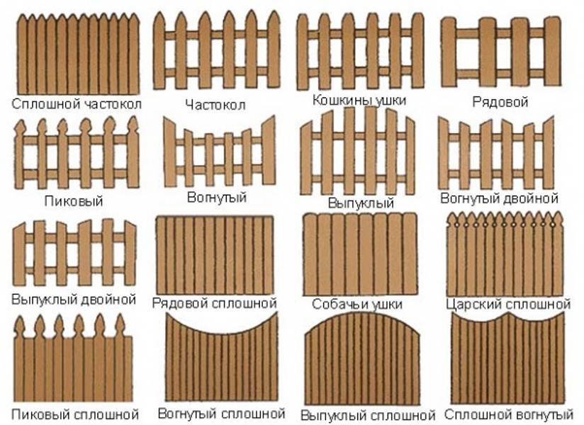 Доски используются не только прямые, но и фигурные, а верхняя кромка забора не обязательно должна быть параллельна земле. Она может быть выгнутой, вогнутой, в виде волны или другой формы. Ниже показаны различные виды штакетника.