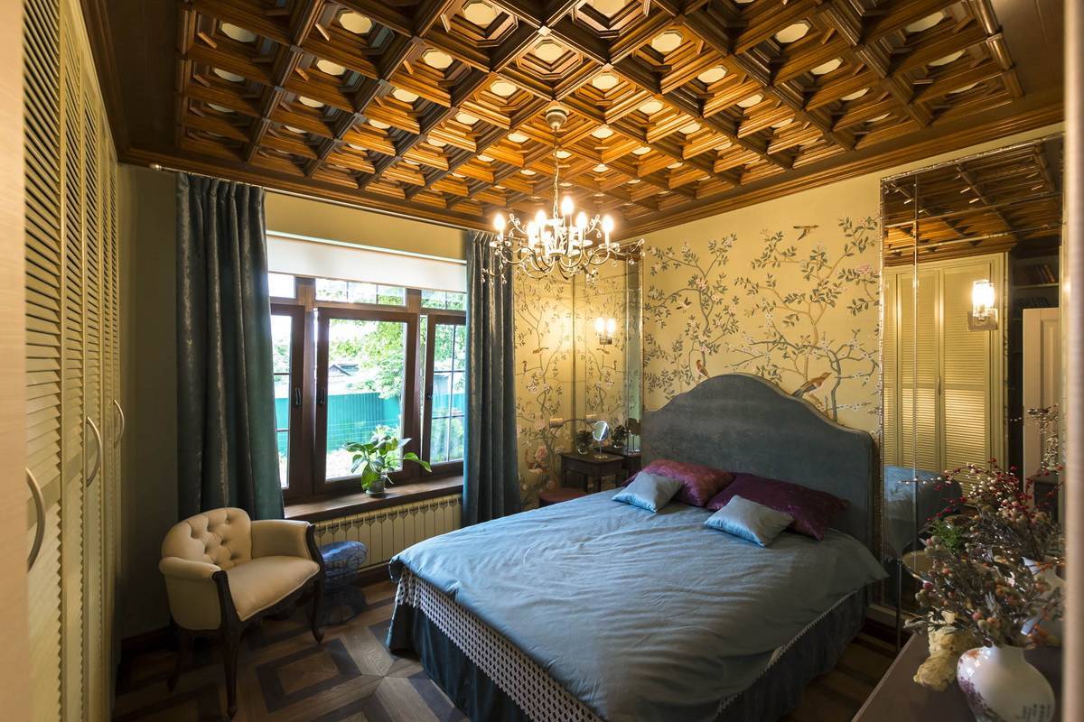 Потолок, оформленный деревянными деталями, имитирующими потолочные балки, хорошо сочетается, как с дизайном в стиле лофт, так и в японском, английском, прованс или кантри.