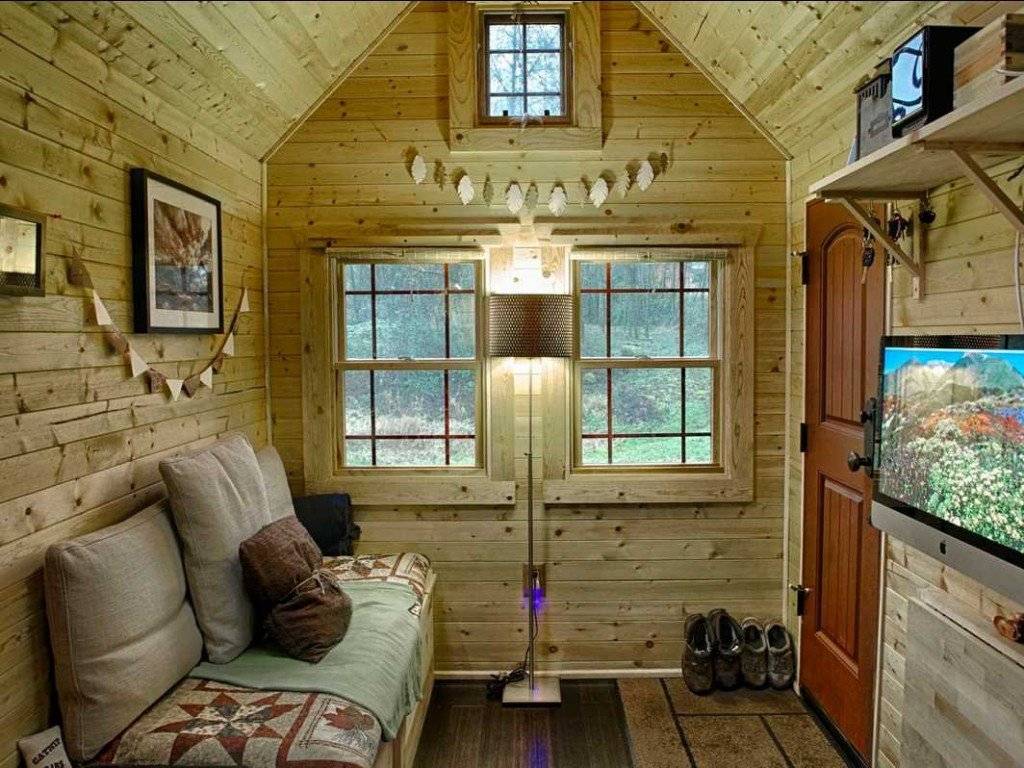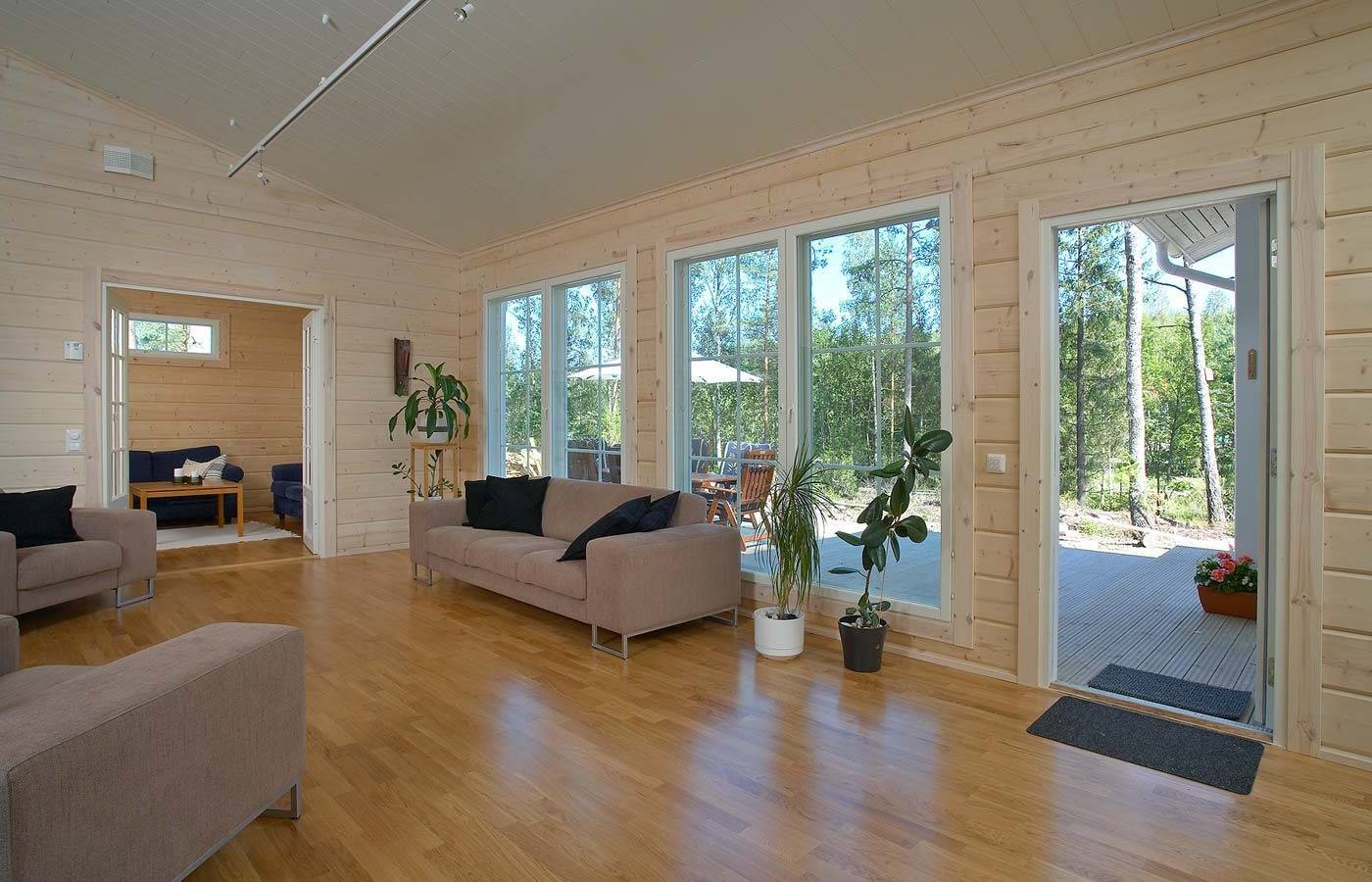 Покрытые деревом стены, пол и потолки уместны в высоких помещениях с большими окнами, а количество мебели при этом должно быть минимальным, например: мягкий уголок, маленький столик и ковер светлых оттенков.