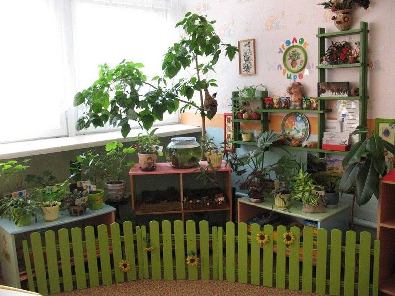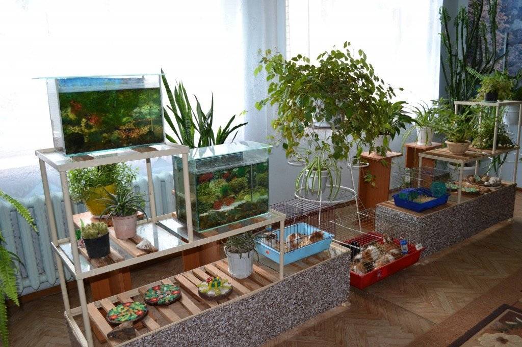 Здесь же часто располагают различные комнатные растения в горшках – важно выбирать исключительно не ядовитые, не способные вызвать аллергию, травмировать любопытных детей шипами, колючками. Дети дают животным корм, под присмотром взрослых убирают клетки, поливают из леек цветы, познавая мир флоры и фауны