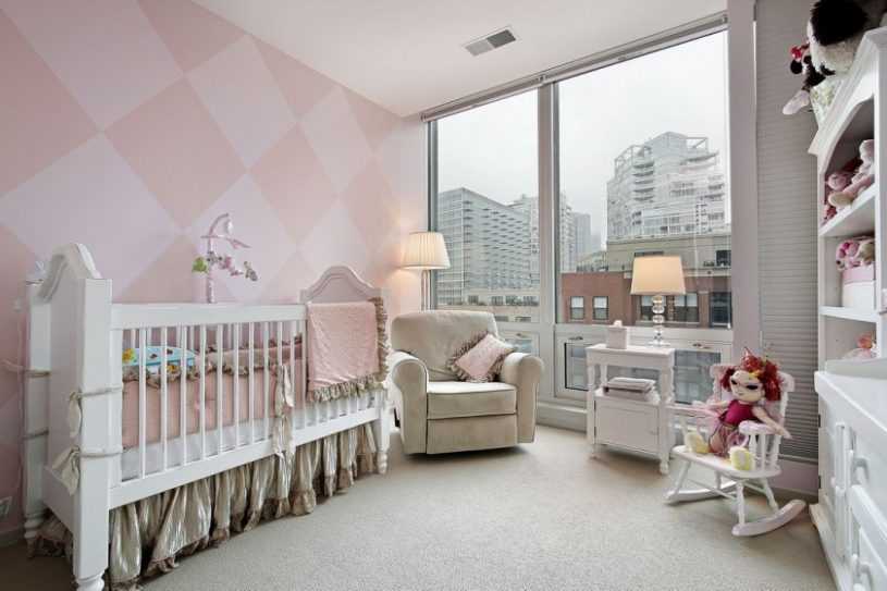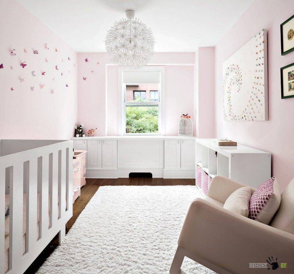 На фото современный интерьер детской для новорожденной девочки, выполненный в белых и пастельно-розовых тонах.