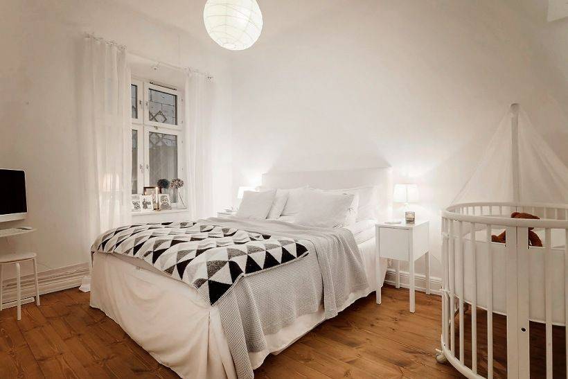 В родительской спальне для организации места для сна новорожденного малыша, лучше выбрать более укромное угловое пространство. При обустройстве следует обеспечить удобный подход к кроватке ребенка, а также позаботиться о комфорте и безопасности младенца.