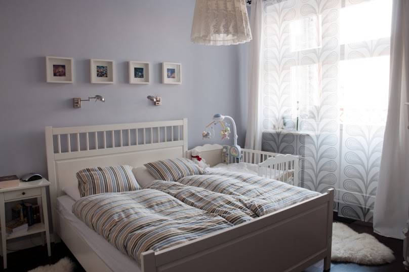 В совмещенной комнате новорожденного и родителей желательно придерживаться единого стилевого решения. Например, если взрослая кровать имеет светлое исполнение, то детская колыбель должна быть выдержанна в аналогичной гамме. Люлька может отличаться контрастным оформлением, в таком случае общий интерьер спальни следует дополнить идентичным ярким декором.