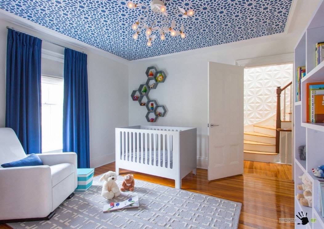 Потолок в комнате малыша – это самое подходящее место для того, чтобы разместить декорации, способствующие развитию ребенка. Популярностью пользуются навесные декоративные элементы и светящиеся ночью шарики. Эти аксессуары рекомендуется располагать над кроваткой.