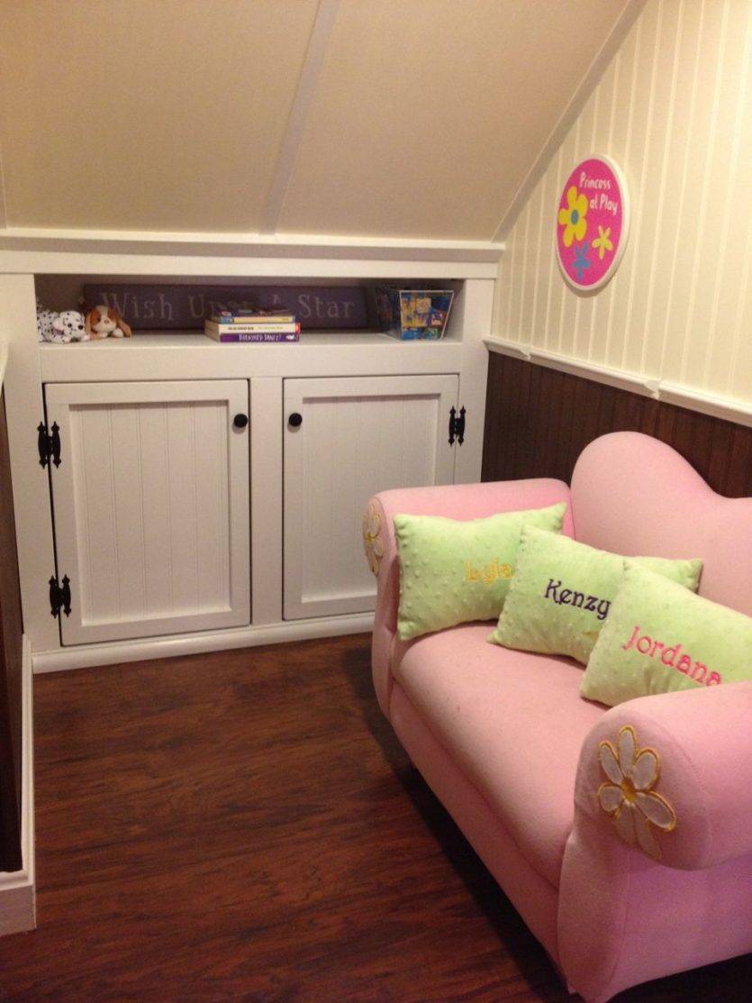 Шкафы для вещей, игрушек и книг располагают вдоль скатов. Лучше, если это будет эргономичная встроенная мебель, с множеством полок и выдвижных ящиков. Для игрушек можно придумать красивые ящики или сундуки, а сверху на крышку положить мягкий матрасик с цветными подушками. Таким образом, получится не только место для хранения, но и красивый диванчик.