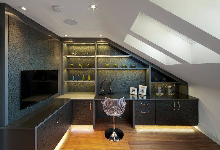 Для многих людей работа на дому является нормой, поэтому офис будет весьма кстати. Мансарда идеально подходит для домашних офисов, потому что она находятся вдали от общего пространства жилища, исключая шум и гам. Чердачный домашний офис может быть красиво оформлен со встроенным столом и шкафами, включая небольшую зону развлечений в виде дивана и телевизора.