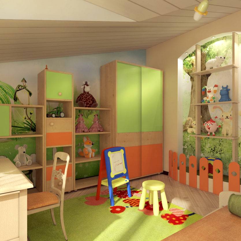 Игровая зона хорошо будет смотреться в районе стеллажей для игрушек. Можно интегрировать столики, стульчики и корзинки для игрушек. Отделка игровой зоны должна вписываться в основной стиль комнаты.