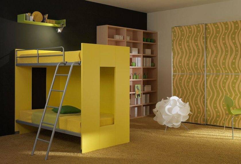 Данная цветовая комбинация представляет собой смелое экспериментальное и энергетически сильное решение. Холодные голубые и теплые желтые тона создают уравновешенный баланс и отлично подходят для спальни подрастающего ребенка.