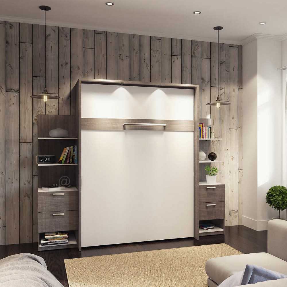 Самым простым и практичным решением становится подъемная кровать. К нижней части стены она прикрепляется подвижными шарнирными механизмами. С конструкцией может справиться любой человек: от подростка до пенсионера. Задняя часть подобной кровати может быть замаскирована под шкаф.