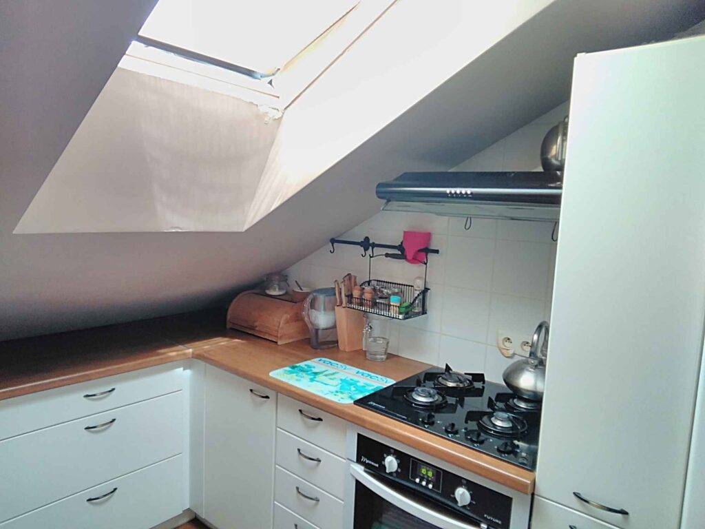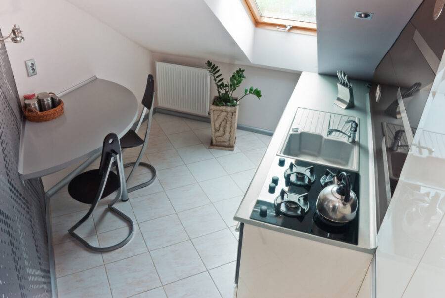 Тогда обустройство мансардной кухни – единственный, но не проблемный вариант выхода из ситуации. Однако следует помнить, кухня на мансарде также требует освещения и вентиляции, и лучшим для вас будет естественный солнечный свет и свежий воздух.