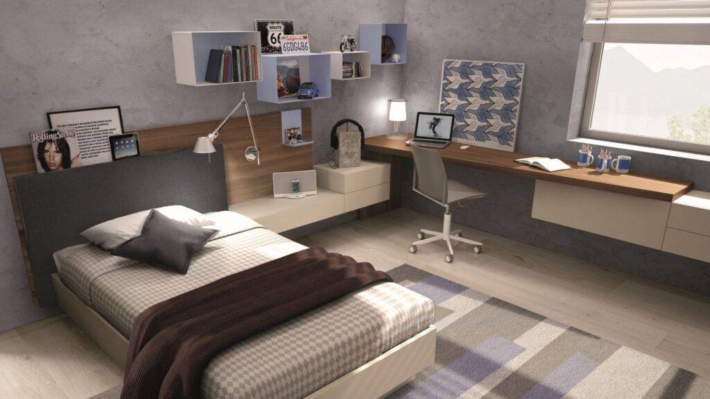 Если оборудуют не маленькую спальню для подростка, то может присутствовать отдельное пространство для пассивного отдыха, занятий по интересам. В небольшом помещении пространство не позволит размахнуться, удовлетворяя все потребности. Некоторые зоны легко компактно объединить.