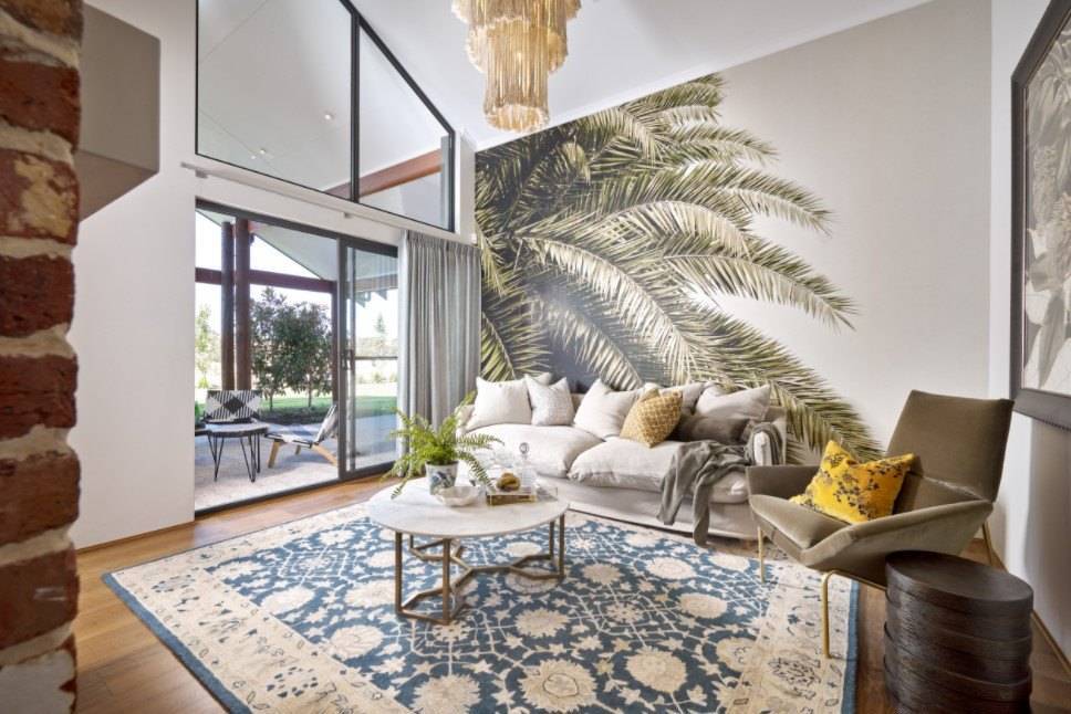 Не менее оригинальным и удачным решением можно назвать зонирование пространства гостиной при помощи различного сочетания оттенков и фактур на обоях. Таким способом можно выделить более яркими или рельефными полотнами зону чтения, каминную зону, область рабочего кабинета и место, где предполагается установка мягкой части и просмотр телевизора. Подобная идея сделает гостиную одновременно многофункциональным и уютным помещением, что особенно актуально в открытых планировках или проходных комнатах.