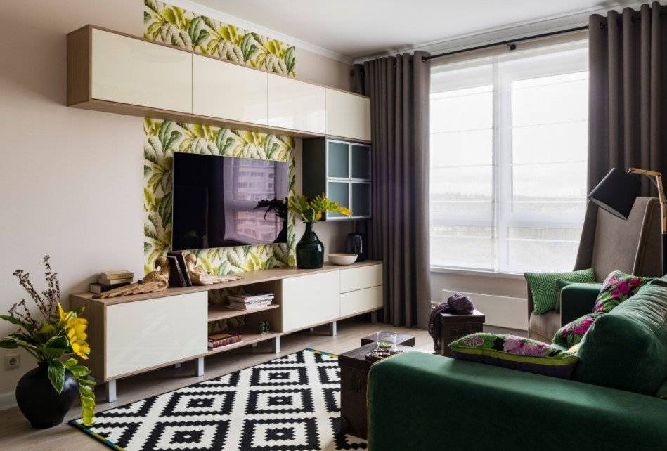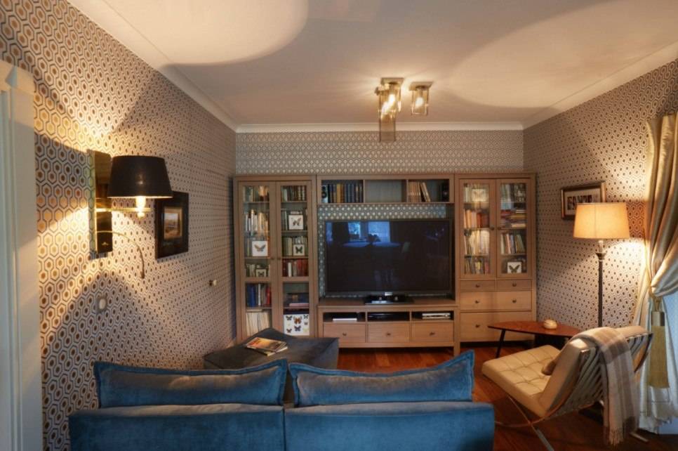 Нестандартная форма помещения или низкие потолки – это лишь некоторые из нюансов, с которыми можно столкнуться во время ремонта в гостиной. Поэтому такое решение, как сочетание обоев на стенах с разной расцветкой, фактурой и рисунками, в большинстве примеров, поможет исправить многие недостатки. Одним из таких «секретов» обустройства гостиной считается исправление или коррекция пространства помещения при помощи выделения одной из стен более контрастными по цвету обоями. Вертикальное расположение узоров или принтов визуально поднимает потолок. Горизонтальное, наоборот, расширяет стены. Очень интересно в таком примере смотрятся обои-компаньоны, которые сочетаются между собой по цвету, но отличаются рисунками или наоборот.