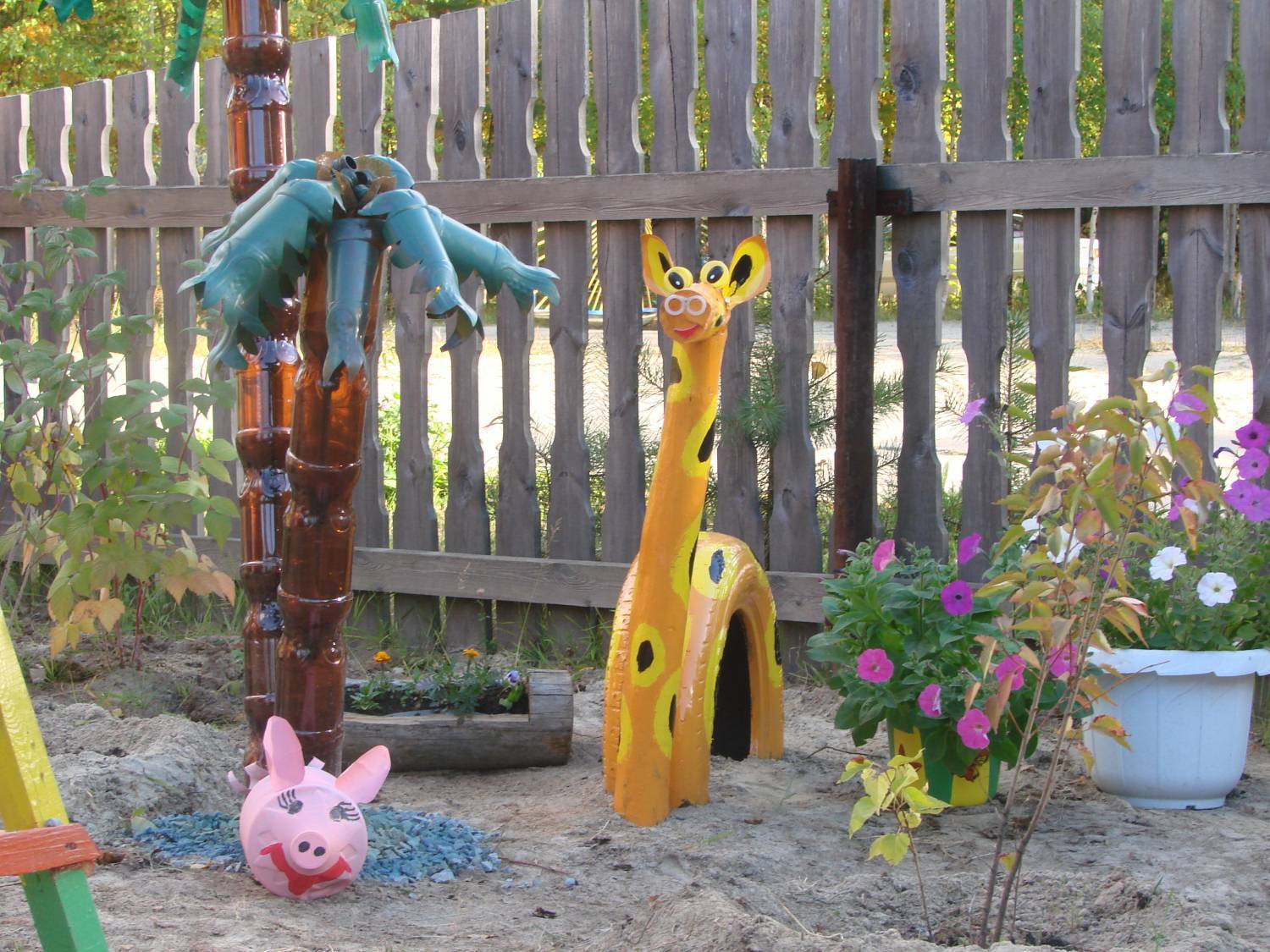 С помощью покрышек и пластиковых бутылок можно замечательно дополнить детский уголок на даче