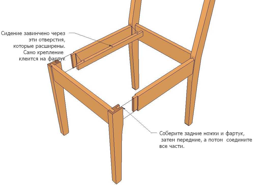 Когда дело дойдет до сборки, то начните с ножек. Вам понадобятся 8 брусков и саморезы. После установки каркаса, установите сиденье и плотно закрепите его. Чтобы закрепить конструкцию, используйте столярный клей.