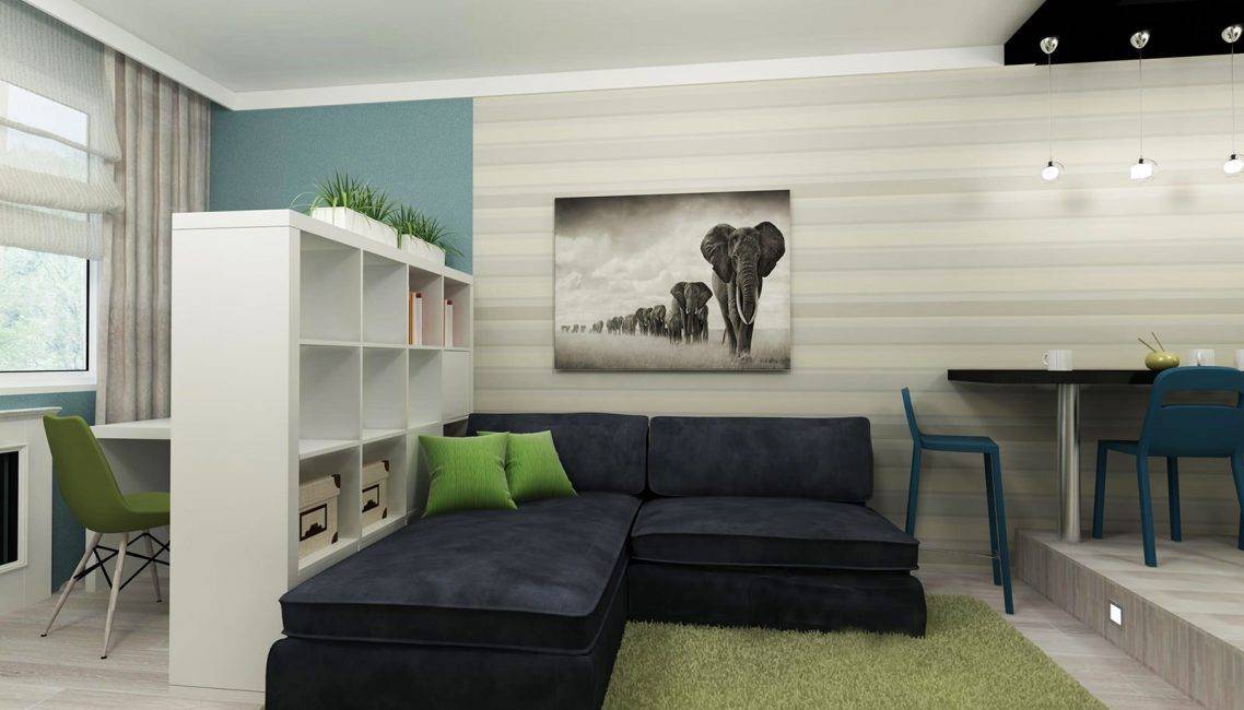 - Зрительная корректировка помещения – мебель, установленная посредине, визуально разделит его на две части.